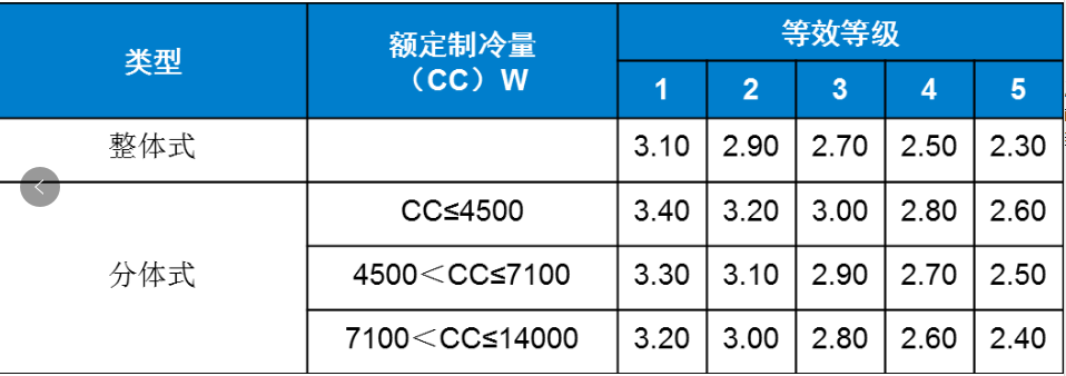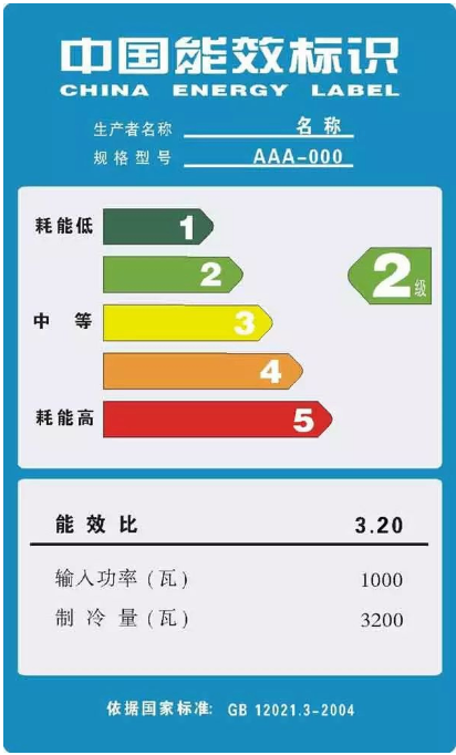 《GB 12021.3-2004 房间空调调节器能效限定值及能效等级》旧标准,中国能效标识划分5个等级: