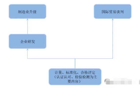以新产品或某工厂为例,说明国家质量基础设施重要作用。首先,新产品 A 要想上市销售,要获得对应的质量“认证”,分不同的产品种类,有些认证是必须要有的,属于强制性认证,有些认证不是上市销售必须要有的,则属于非强制性认证的自愿认证;然后,向认证机构提出申请,认证机构提出认证规范,最重要的是提供一系列的指标,这些指标达标才可以获得认证,这些指标就是一些列的标准,包括国际标准、国家标准等;然后,将产品样品送至实验室,检测不同的指标,这些实验室根据国家标准进行检测,将检测数据反馈给认证机构;其次,认证机构将检测数据与标准进行比对,如合格,则颁发相关认证。
