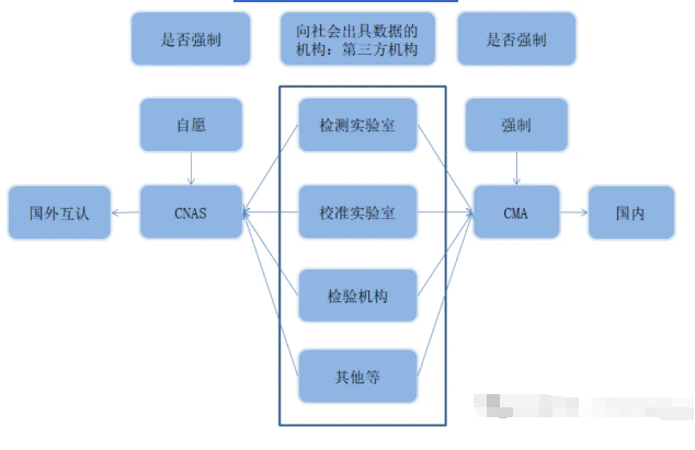 在以上环节中,检测实验室承担了最基础、最重要的检测工作,如需检测数据有效,则必须通过 CMA认证、自愿进行 CNAS 认可。在以上整个过程中,实验室在整个过程中提供最重要、最基础的实验数据,之后的认证工作都是基于此数据,因此实验室的数据至关重要,我国对实验室亦有一套严格的管理制度,简单说,可以认为,向社会提供实验数据的机构,必须通过中国的 CMA 认证,这 CMA 认证只在国内有效;实验室自愿可以申请 CNAS 认可,CNAS 认可与国外的实验室认可制度互认
