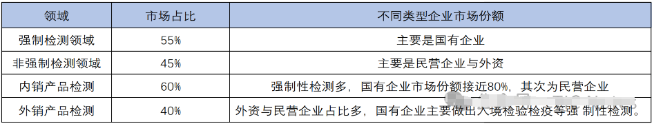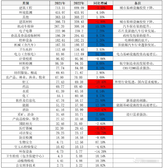 表:我国检测行业细分领域营收对比分析