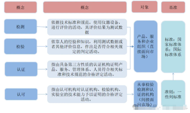 检验检测是合格评定环节的组成部分,是践行标准的重要环节。合格评定主要包括检测、检验、认证、认可四种类型。