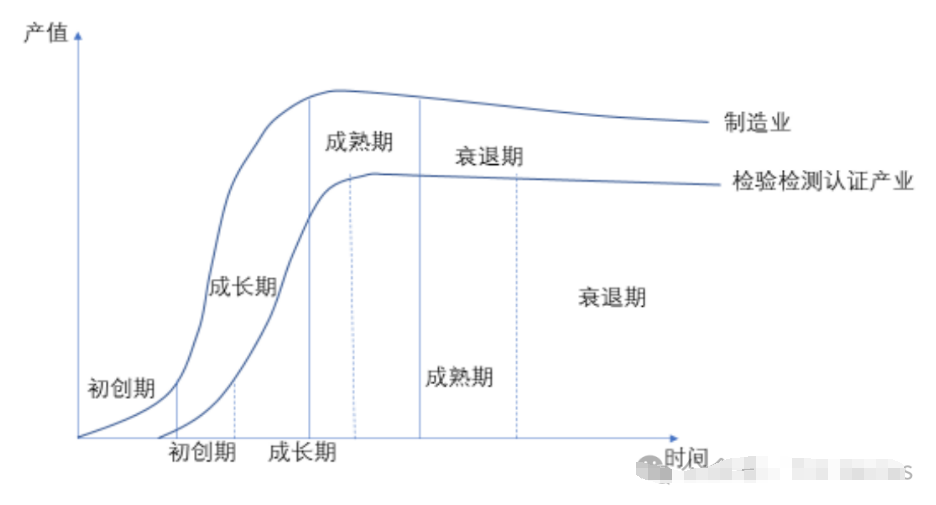 由此以上分析,即使在传统领域检测行业依然能够保持增长,且新兴领域不断出现,其生产服务性显著,检测行业与制造业关系如下图所示,其将伴随制造业升级而快速增长,到成熟稳定期,其产能依然能够稳定。